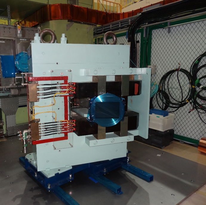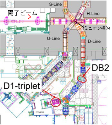 ミュオン科学研究系(MUSE)のビームライン電磁石 RCSで3GeVまで加速された陽子はミュオン標的に衝突し、そこで生成されたミュオンはMUSEビームラインの電磁石によって各実験エリアへ輸送される。 MUSEに建設された4本のビームラインのうち、最初に稼働したのが崩壊ミュオンビームライン(Dライン)である。Dラインでは偏向電磁石(DB2)がミュオンビームを40度曲げて、下流にある2つの実験エリア(D1エリア、D2エリア)にビームを導いている。さらにD1エリアの最下流には3連の四重極電磁石(D1トリプレット)が設置されて、実験試料に照射するミュオンビームの形状を最適化している。