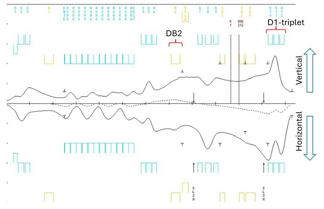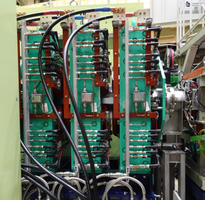 DラインのD1実験エリアの最下流に設置されているD1トリプレット電磁石(DQ10-11-12)は最大67MeV/cのミュオンの輸送が限界であったが、90MeV/c以上のミュオンを用いた実験のニーズに対応するため、高運動量のミュオンの輸送が可能なトリプレット電磁石および電源への交換を行った(図5)。新トリプレット電磁石はコイル巻数の増加により、各磁極間のピッチおよびエンドガードの位置が旧トリプレット電磁石と異なるため、染み出し磁場(fingering field)の干渉効果と有効磁場長を考慮した電流の最適化が必要であった。このため、ビーム輸送プログラム(Transport)を用いて励磁電流を最適化し(図6)、D1トリプレット通過後のビームサイズが交換前後で変わらないように最適化電流によるチューニングが行われ、現在稼働中である。